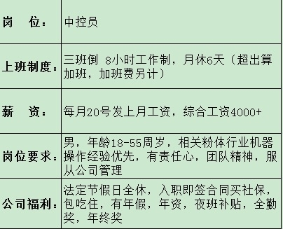 初中以上文化,8小时3班制,月休6天,法定假日全休,免费发放工作服及劳保防护用品,不扣任何房租水电,有粉体厂立磨数控相关工作优先,有责任心,服从公司工作安排,招新手(入职有专人教),加班费另计。每月20日准时发放上月工资,绝不从不也不迟发拖欠员工工资