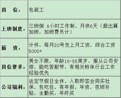 三班8小时,月休6天(超出算加班,加班费领计)计件,每月20号发上月工资,工资5000+