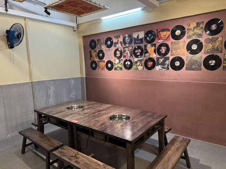 前厅设备:格力五匹天花空调等共七台。全店近全新23套高品质火锅桌椅电磁炉。