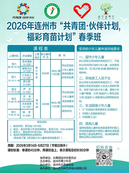 连州市青少年宫开始招生啦,390元学一期(13次课),开设课程有美术,书法,...