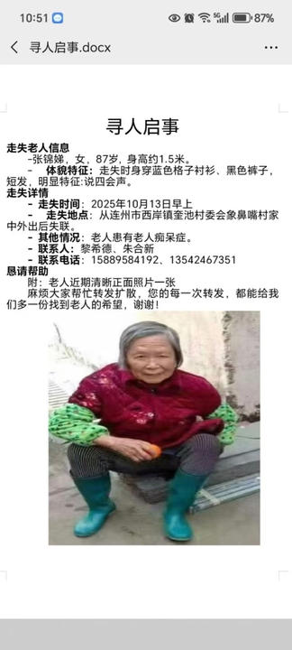 同村一个老人从10月13日走失至今未找到