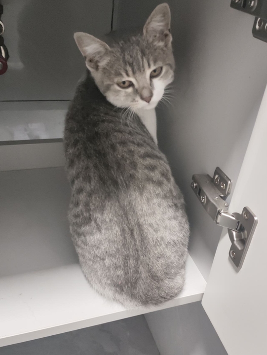 在南门良心糖水店附近捡到一只小猫,像英短蓝白配的灰色小狸花,很干净亲人...