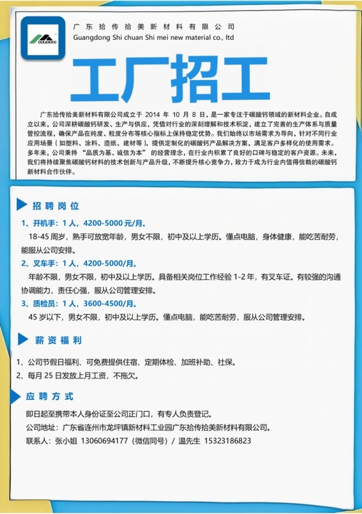 45岁以下,男女不限,初中及以上学历。懂点电脑,能吃苦耐劳,服从公司管理安排。公司节假日福利、可免费提供住宿、定期体检、加班补助、社保。