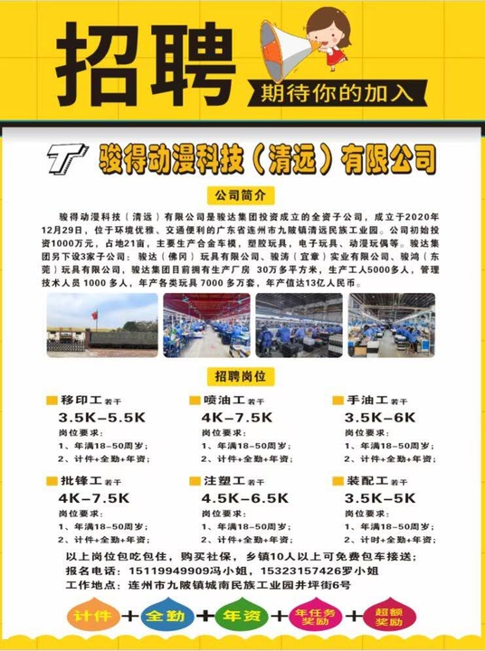 骏得动漫因订单量大,现招聘临时工/短期工多名,同工同酬,包吃住,报名咨询电话*****9909