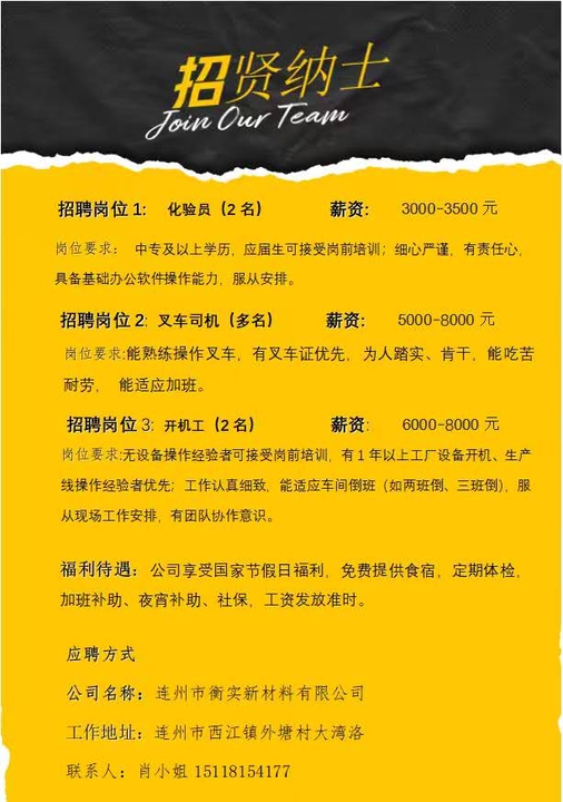 招聘化验员1名,仓管1名